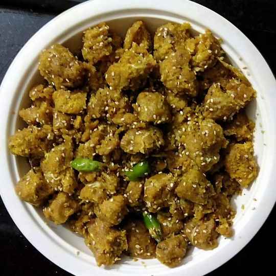 A bowl filled with a mixture of meat and vegetables, including green peppers and sesame seeds, is placed on a surface. The meat appears to be cooked and seasoned, with a variety of textures and colors. The vegetables are scattered throughout the dish, adding a pop of green to the otherwise brown and beige tones of the meat. The sesame seeds are sprinkled on top, adding a nutty flavor and crunchy texture to the dish. | Photo of Dudhi na muthiya by Dipika Ranapara at BetterButter | 2a718c526e9d5a522051a2611a465192d00a49173b33e3382cdf18dd04fb5612 | 000910680999 | 0 | 0 | 75 | 10 | 0 | 0 | |