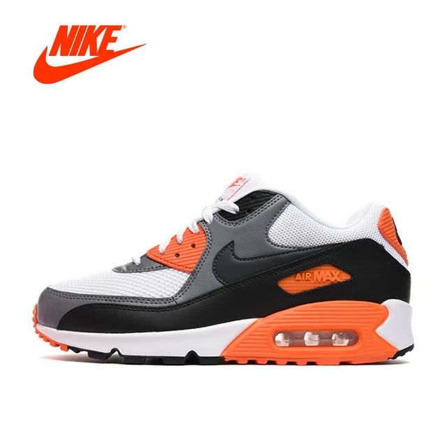 A white and black Nike Air Max sneaker with orange accents is displayed against a white background. The sneaker features a black upper with white accents, a white midsole, and orange accents on the heel and toe. The Nike swoosh logo is visible on the side. The sneaker is placed on a surface with a shadow cast beneath it, and the Nike logo is also visible in the top right corner. | Men's Nike Air Max '90 Essential Shoe | 0c53ef8a71ec0db8d56b3007e85026325bc18f61ea46e3d23a5334bd03eddebd | 000910682722 | 0 | 0 | 71 | 7 | 0 | 0 | |