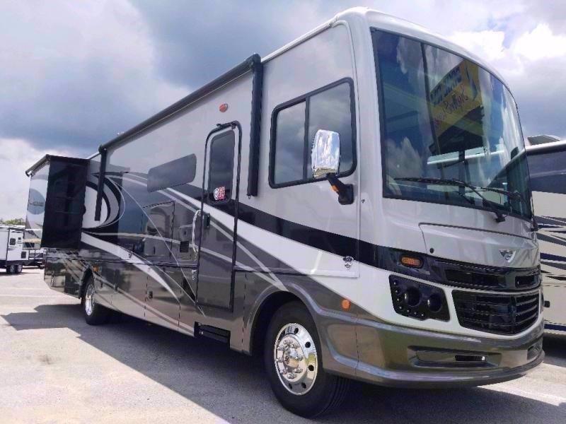A modern recreational vehicle with a shiny metallic finish is parked in a lot. The RV has a large windshield, side windows, and a rear door with a step. It features a prominent front grille and headlights, and the overall design suggests a contemporary style. The sky is partly cloudy, and there are other RVs in the background. | 2021 Fleetwood RV BOUNDER 36F | 8e9a04a4fe942144840d3453466f59117ba3186a6a2b1f337fd70ad7f54b9250 | 000910682634 | 0 | 0 | 58 | 5 | 0 | 0 | |