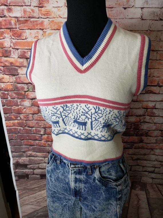 A mannequin is wearing a white sweater with a blue and pink collar and a blue and pink striped neckline. The sweater has a pattern of trees and a deer on the front. The mannequin is also wearing blue jeans. | 1970s Reindeer Sweater Vest Christmas Vest / Ugly\xe2\x80\xa6 - image 2 | 5d4e70adc8c0fde2c6e1acd00358ba1449d8acf3236a4f3c0ad8f87422e13d71 | 000910682781 | 0 | 0 | 40 | 11 | 0 | 0 | |