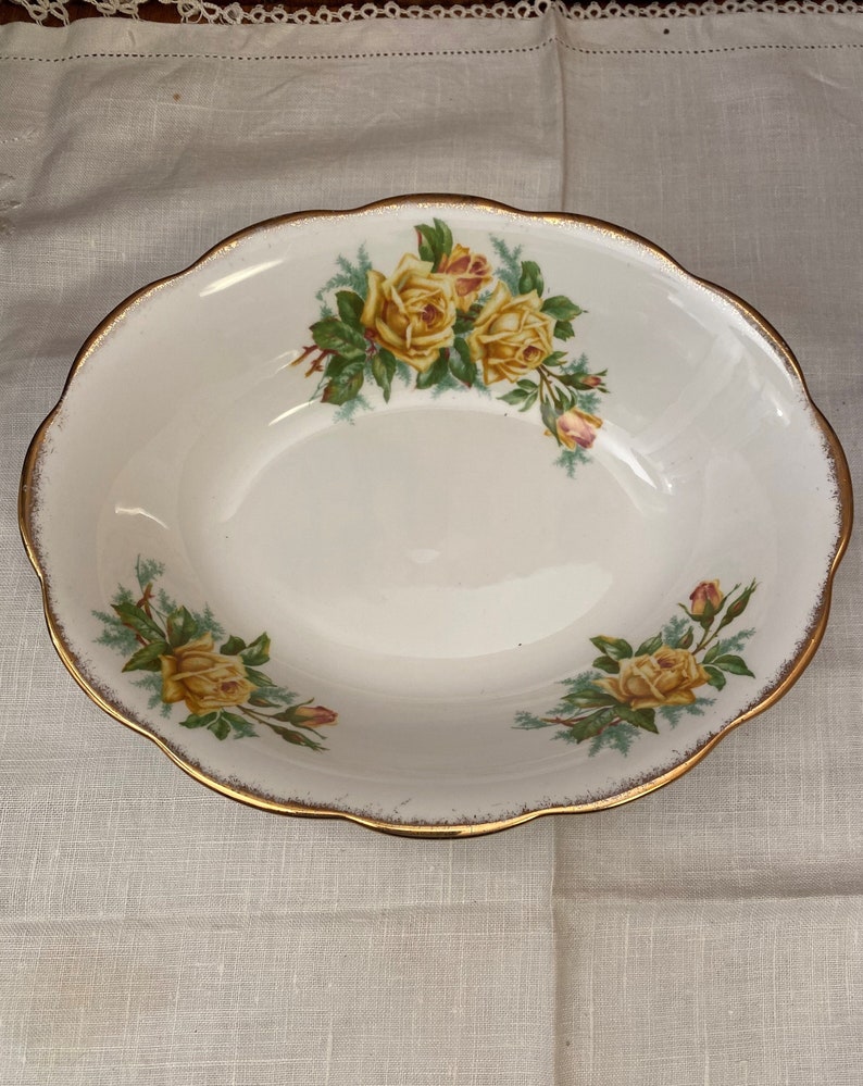 A white porcelain bowl with a gold rim and a floral design featuring roses and greenery sits on a white lace tablecloth. | Vintage Royal Albert Tea Rose Yellow 9" Round Vegetable Bowl | 1aa11ecac4059a580b0aacf341b70aabc7c6d64a0f236c63839e8cd1799e82d5 | 000910682526 | 0 | 0 | 22 | 10 | 0 | 0 | |