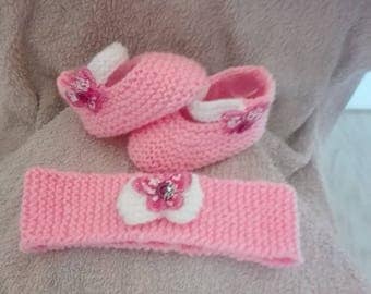 A pair of pink knitted baby shoes with white soles and a pink bow on the toe, placed on a soft pink knitted headband with a white bow in the center. The headband is lying on a beige surface. | Set of booties and 0/3 months baby headband | 6a402b61c7a7aadc108613b16feadafff12545a62f177a535c37700ffa087017 | 000910682666 | 0 | 0 | 39 | 8 | 0 | 0 | |