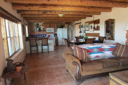 A spacious living room with a brown leather couch, a wooden coffee table, and a wooden chair. The room has a tiled floor, wooden ceiling beams, and a large window with blinds. There is a kitchen area with a refrigerator, sink, and cabinets. The walls are adorned with framed pictures and mirrors. | The Earth House: A Desert Adobe - Willcox | a1db5b85bbe554240581233c2fe32d4946caf9137ed2e88917fa511aea72ae3c | 000910682983 | 0 | 0 | 52 | 8 | 0 | 0 | |