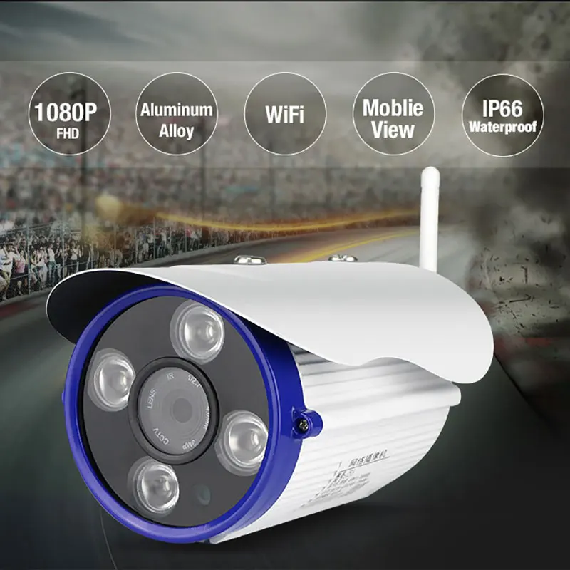 A modern security camera with a sleek white and blue design is displayed against a blurred background with text labels for '1080P', 'ALUMINUM', 'WIFI', 'MOBILE VIEW', 'IP66', and 'WATERPROOF'. The camera has a circular array of bright LED lights around the lens and a small antenna on top. | Vstarcam 1080P 2MP Bullet IP Camera Outdoor Motion Detection Waterproof Night Vision Security CCTV Camera C51S vstarcam c51s 2mp outdoor ip camera hd 1080p wifi waterproof bullet camera night vision 20m seucrity cctv surveillance camera | c15ee59b69e4e69adb96b0dc1650d6644b00b4c152dc4573d81c76e9104d2d75 | 000910682965 | 0 | 0 | 48 | 35 | 0 | 0 | |