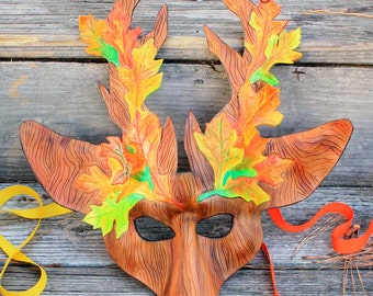 A wooden mask with a deer head design, featuring a pair of antlers and a face with a nose and mouth, is placed on a wooden surface. The mask is adorned with colorful autumn leaves in shades of orange, yellow, and green, and there are ribbons of yellow and orange fabric around the base of the mask. | Leather Autumn Stag Mask Made to Order Great for Halloween Burning Man Masquerade Costume LARP Cosplay Mardi Gras Festival | e65dbaaad9866d7adb5932247055051f5565bd31fff7c84578719a4bd09f4dc2 | 000910683094 | 0 | 0 | 57 | 19 | 0 | 0 | |