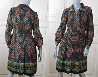 A mannequin is dressed in a colorful, patterned dress with a fitted bodice and a flared skirt. The dress features a high collar and a belt at the waist. The mannequin is positioned against a white background with a wooden floor, and there is a mirror reflection of the mannequin on the right side of the image. | 1970s Abstract Floral Dress, Knee-Length Hungarian Vintage Colorful Hostess Dress: 8 US, 12 UK | 7ebc56c0cab4602887f7e95710ca786e4dfe298fd53f44c53b44f9160ffc7027 | 000910683903 | 0 | 0 | 57 | 14 | 0 | 0 | |