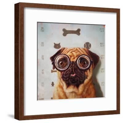 A framed picture of a pug wearing round glasses is displayed on a wall. The pug is looking directly at the viewer with a tongue sticking out. The background of the picture features a pattern with a bone, a baseball, and various other shapes and numbers. The frame is brown and complements the picture. | Canine Eye Exam-Lucia Heffernan-Framed Art Print | db578d64332536a9d0b80e4d15cb4ba016a564064119b31244646b074b7e4619 | 000910684011 | 0 | 0 | 54 | 6 | 0 | 0 | |