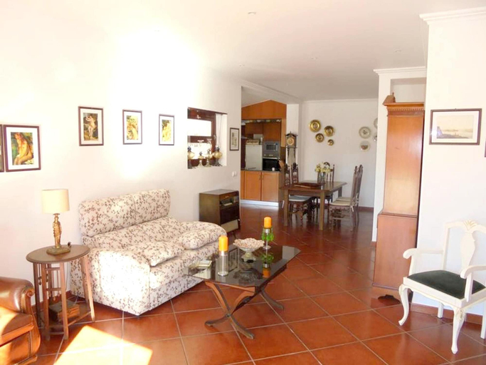 A cozy living room with terracotta tiled flooring, a floral patterned sofa, a wooden coffee table with a glass top, and a wooden side table with a lamp. The room has a warm ambiance with sunlight streaming in from the left side, casting shadows on the floor. The walls are adorned with framed pictures, and there is a wooden cabinet with a microwave and a clock on top. A wooden dining table with chairs is visible in the background, and a wooden door is partially open, revealing a glimpse of the hallway. | Apartment With 2 Bedrooms in A dos Cunhados, With Enclosed Garden and, Torres Vedras | 74726e7c49aabbaa8af6d7647c0767f9d894e09ce1d90e6c7b86a19555d9137a | 000910683902 | 0 | 0 | 92 | 14 | 0 | 0 | |