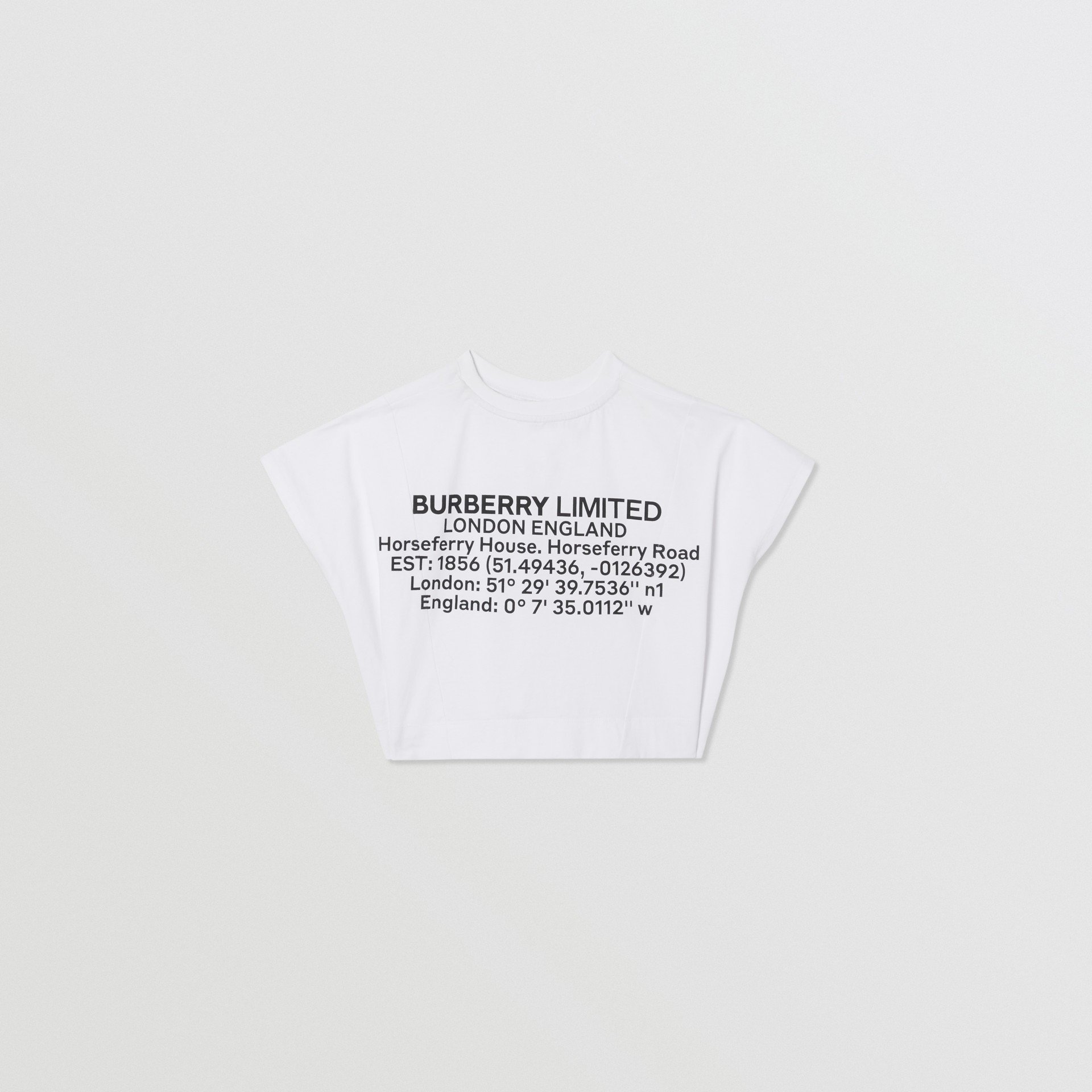 A white t-shirt with a graphic design featuring the text 'BURBERRY LIMITED' and a map of London with various coordinates and measurements. The t-shirt is placed against a plain white background. | Location Print Cotton Top in White | Burberry - gallery image 3 | f119706fad70f78ba1f578b79eb6fc0be9282a826bb901e7ee13a234d290e09f | 000720946440 | 0 | 0 | 31 | 12 | 0 | 0 | |