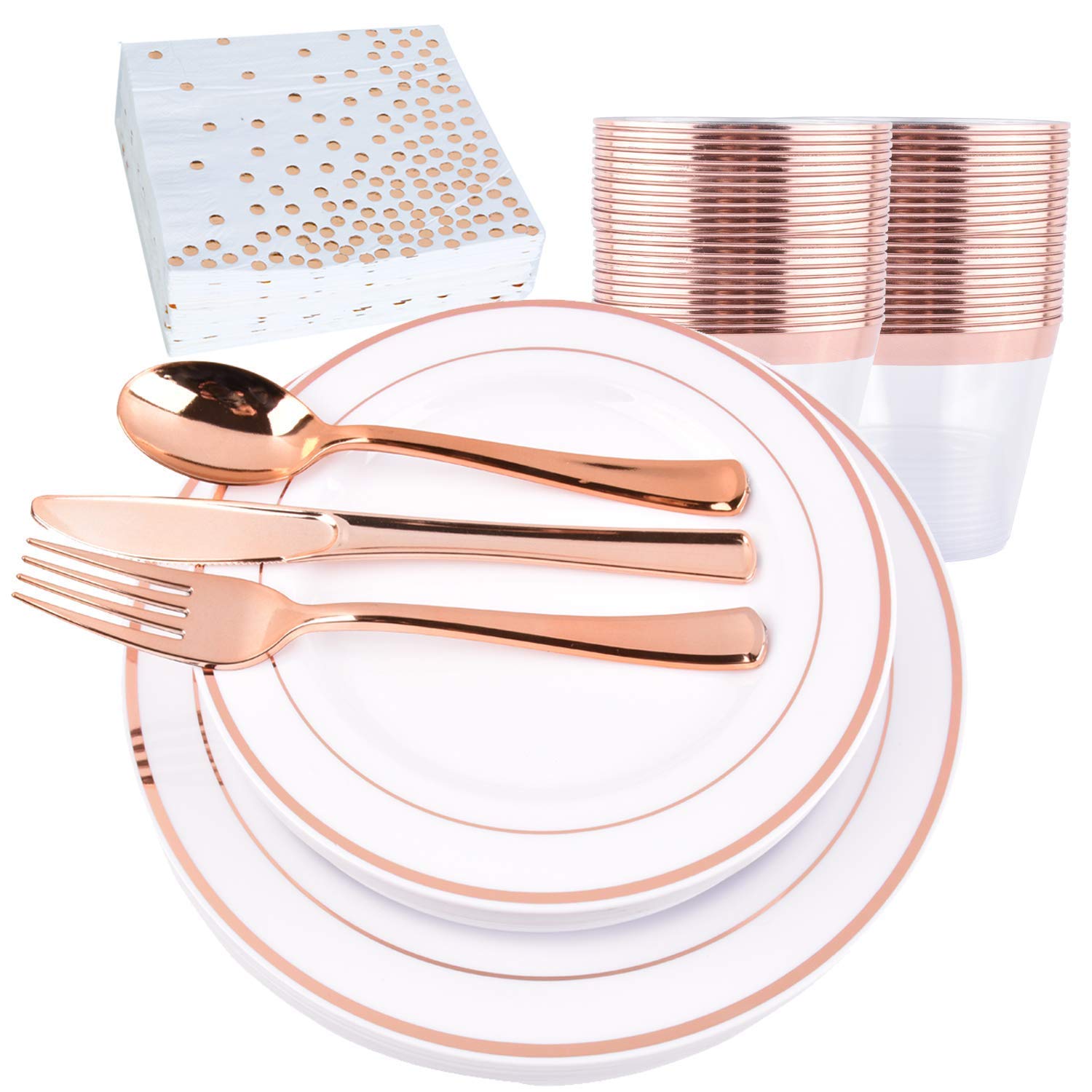 A set of rose gold cutlery with a spoon, fork, and knife, placed on a white plate with a gold rim. The plate is on a table with a white and gold textured placemat. In the background, there are two rose gold cups and a white cup with a gold rim. | H3 Innovations-200pc Rose Gold Plastic Plates, Rose Gold Silverware, Rose Gold Plates, Rose Gold Cups, Rose Gold Napkins, Rose Gold Straws, Rose Gold Disposable Dinnerware by H3 Innovations (Image #2) | 886ac3a002f2a2209ff1d15181d6e9d881a7ed4355593bb8d3f6c527604ce8bf | 000720946416 | 0 | 0 | 51 | 30 | 0 | 0 | |