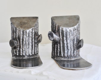 A pair of silver, ornate, and intricately designed boots with a pointed toe and a curved, ribbed upper section, placed on a white surface. | Vintage Tree Stump Metal Bookends, Modern Rustic Bookend, Handmade Silver Metal Bookends, Nature Library, Garden Library, Wedding Bookends | edbcfeb524152ea5e8c534134de418c9b4d110a05967fcf212dd0197c41fa98b | 000720946566 | 0 | 0 | 24 | 18 | 0 | 0 | |