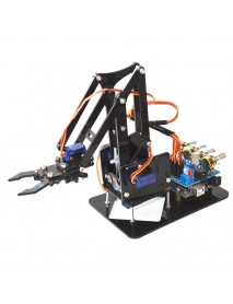 A robotic arm with a black and orange color scheme is shown in a close-up view. The arm has multiple joints and is equipped with various tools and components, including a blue and orange cable, a small blue module, and a yellow and black component. The arm is positioned on a black base with a reflective surface, and the background is a plain white color. | DIY 4DOF Robot Arm 4 Axis Acrylic Rotating Mechanical Robot Arm With UNO R3 4PCS SG90 Servo | f3954dd373593ddee0f6d856ef2141a97dd526bb3816d3a23e86a592dab6b7e1 | 000720946422 | 0 | 0 | 65 | 17 | 0 | 0 | |