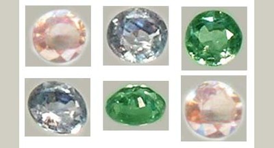 A collection of six gemstones is displayed in a row. The first gemstone is a large, multicolored stone with a pinkish hue on the left side, transitioning to a blue center, and ending with a greenish tint on the right. The second gemstone is a large, clear stone with a white center and a blue rim. The third gemstone is a large, multicolored stone with a greenish hue on the left side, transitioning to a yellow center, and ending with a pinkish tint on the right. The fourth gemstone is a large, clear stone with a white center and a blue rim. | Alexandrite Antique 19thC Russia Natural 3\xc2\xbdmm Color-Change Genuine Handcrafted | 0e33bc9e8e419dd030a2977565d92f8256dead58b283c59b26ca1242522cb06e | 000720946472 | 0 | 0 | 102 | 9 | 0 | 0 | |