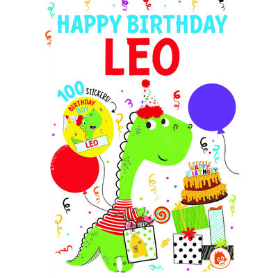 A children's book cover titled 'Happy Birthday Leo' featuring a green dinosaur character with a red party hat and a striped shirt. The dinosaur is holding a gift bag with a yellow dinosaur inside and a gift box with a green dinosaur on top. There are balloons, confetti, and a birthday cake with lit candles in the background. The book is illustrated with a playful and colorful style. | Happy Birthday Leo image number 1 | 3f4b1a7656defd88a2c20abb0c90b9d2ef77412586000086ec0635521d95a89c | 000720946586 | 0 | 0 | 68 | 6 | 0 | 0 | |