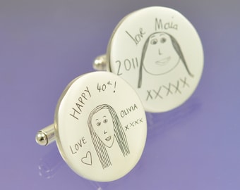 A pair of silver earrings with white enamel backing, each featuring a different drawing of a woman's face. The left earring has a drawing of a woman with long hair and the words 'Happy 40th' written in black cursive script. The right earring has a drawing of a woman with long hair and the words 'Love Olivia xxx' written in black cursive script. Both earrings have a small heart-shaped drawing with the word 'Love' written inside. | Your child's drawing onto a pair of sterling silver cuff links. | 7ef421577c1ae5403d6be463a143dd49122f5befa5b71a9cf821fb8466793b5a | 000720946583 | 0 | 0 | 76 | 11 | 0 | 0 | |