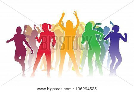 The second image shows a group of seven silhouetted figures dancing in a line, each with a different color. The figures are arranged in a gradient of colors starting from red on the left to purple on the right. The background is a plain white color, and the image includes a watermark with the text 'BIGSTOCK' and a website URL 'bigstock.com/1963444'. | Group of dancing people at a summer party | 97cfa6497cca3b25efc024758b115c6f07966a78846b07d08aba58a3047a9b5f | 000720946724 | 0 | 0 | 61 | 8 | 0 | 0 | |