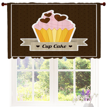 A digital illustration of a window with a view of a lush green landscape. The window frame is white, and the glass is clear. Above the window, there is a decorative brown and white curtain with a large, stylized illustration of a cupcake with pink frosting and chocolate hearts on top. The cupcake has a yellow and pink striped wrapper. Below the cupcake, there is a banner with the text 'CUPCAKE' in a decorative font. The landscape outside the window shows a variety of trees and a field with flowers. | Cake Design Custom Size Valance | 11ad768722ff59fd74b561bc59dd78ed92f07ccbd37ccd4861ed735d1298e7f4 | 000720946710 | 0 | 0 | 90 | 5 | 0 | 0 | |