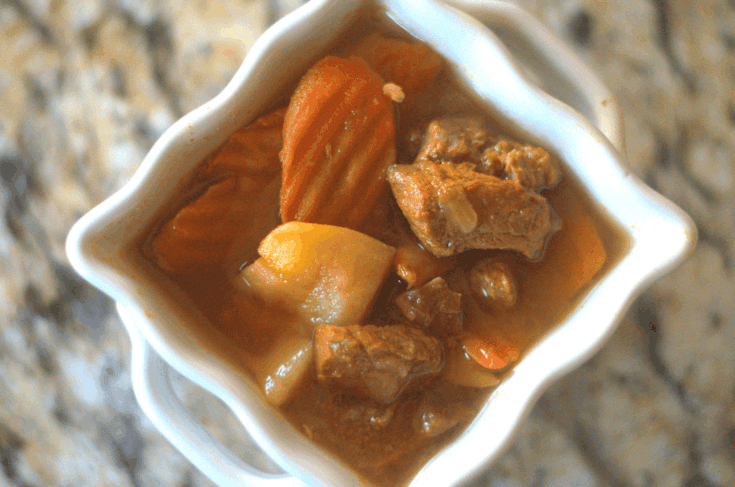 A close-up image of a bowl filled with a stew-like dish. The bowl is white and placed on a surface with a marble-like texture. The dish contains chunks of meat, likely beef, and several pieces of carrot. The meat appears to be browned and the carrots are orange. The stew has a rich, brown gravy, and the overall presentation is appetizing. | Irish Beer Stew | d0a895aed49c41612ffd5fd36884a5f25ce0cc8037e4a23150ea137ef9148a4c | 000720947280 | 0 | 0 | 61 | 3 | 0 | 0 | |