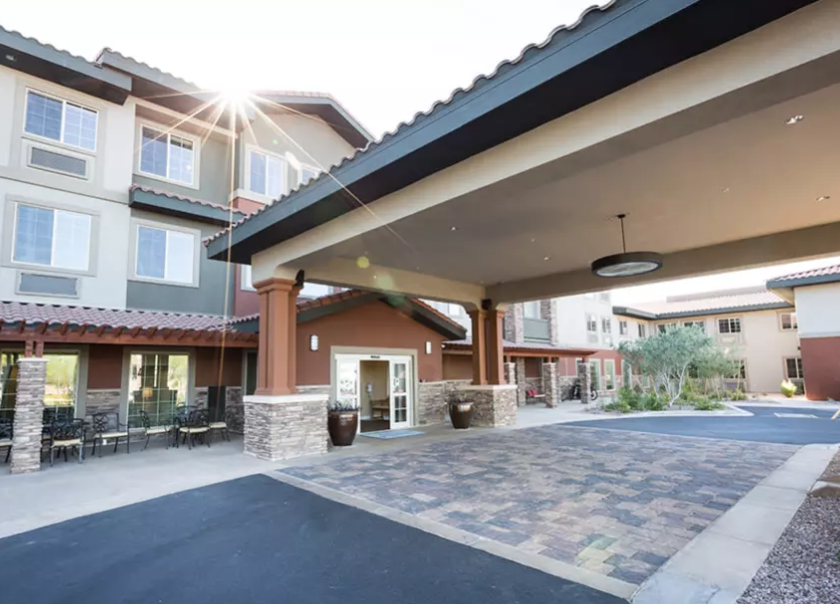 The first image shows the exterior of a modern apartment complex during the daytime. The sun is shining brightly, casting rays of light across the scene. The complex features a series of connected buildings with a uniform design, each with multiple windows and balconies. The architecture includes a prominent overhang with a curved roofline, supported by columns. The entrance to the complex is marked by a stone pillar and a glass door, flanked by two trash bins. The parking area is paved with bricks, and there are outdoor seating areas with tables and chairs. The surrounding landscape includes a few trees and shrubs. | The Enclave at Anthem Senior Living 1 | 95f57a17b26a027f4dc18e3ff1850e75920750ab96c1255d7373189b0851e48b | 000720947332 | 0 | 0 | 103 | 7 | 0 | 0 | |
