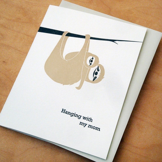 A white card with a brown and black illustration of a monkey hanging from a tree branch is placed on a wooden surface. The card has a message that reads 'HANGING WITH MY MOM' in black text. | Hanging With Mom And Baby Sloth Letterpress Card | aa332e5cc9fe204afc48a707b87d0118d57270cdf1a5d94a47807ef05c17f3d5 | 000720947305 | 0 | 0 | 37 | 8 | 0 | 0 | |