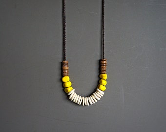 A simple necklace with a brown leather cord and a white and yellow bead design is displayed against a grey background. | Neon Ceramic Necklace, Bone Necklace, Coconut Shell Necklace, Bohemian Necklace, Tribal Necklace, Neon Yellow Necklace, Statement Necklace | 7a599a6b01d084b44f6ee354373d35f327760c58205ed2bcb07312e3e29765a4 | 000720947378 | 0 | 0 | 21 | 17 | 0 | 0 | |