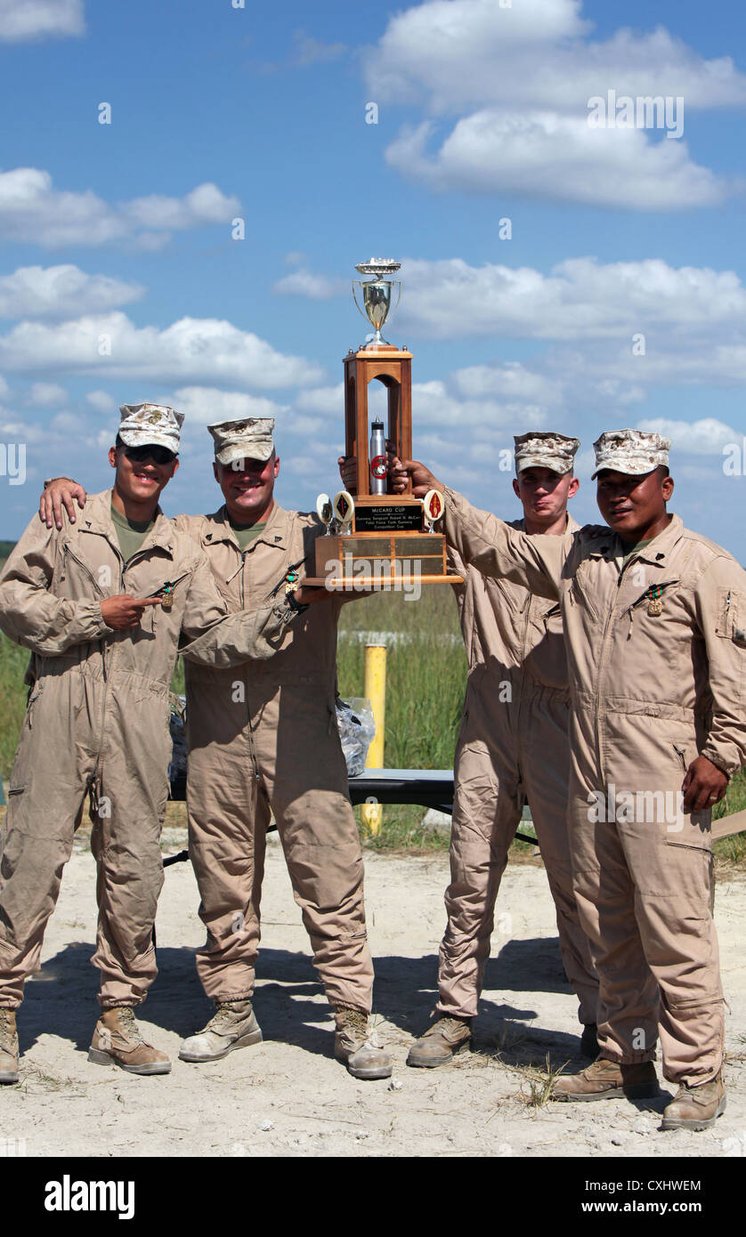 A group of four soldiers in uniform are posing for a photo with a trophy. They are standing on a dirt ground with a clear blue sky in the background. The soldiers are wearing camouflage uniforms and are smiling. The trophy is held by the soldier in the center, who is wearing a hat with a badge. The other soldiers are standing to the left and right of the center soldier, with one soldier on the far left holding a trophy. | (Left to right) Lance Cpl. Delio Linares, loader; Cpl. Ryan Hanna, gunner; Lance Cpl. Domenic Kalaski, driver; and - Stock Image | feb177c57433d8138bc9d81c6489fa1b0c47393acdbec79c9bda5ec2caa9d19b | 000720947548 | 0 | 0 | 81 | 21 | 0 | 0 | |