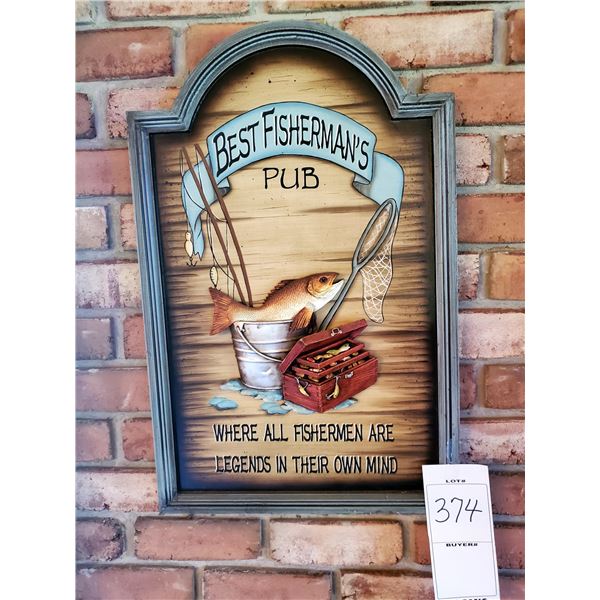 A wooden sign with a decorative frame hangs on a brick wall. The sign features a cartoon fisherman holding a fishing rod, with a fish in the bucket. Above the fisherman, the sign reads 'BEST FISHERMAN'S PUB' in bold letters. Below the fisherman, there is a quote that says 'WHERE ALL FISHERMEN ARE LEGENDS IN THEIR OWN MIND'. The sign has a vintage look with a weathered appearance, and there is a price tag attached to the bottom right corner with the number '374'. | Fisherman\'s 3D Wood/Resin Pub Sign, 27" x 17.5" | ac16ab65bb90033c56b532e29ed409685f8a0bdc48d64f2618696d195e186658 | 000720947448 | 0 | 0 | 84 | 8 | 0 | 0 | |