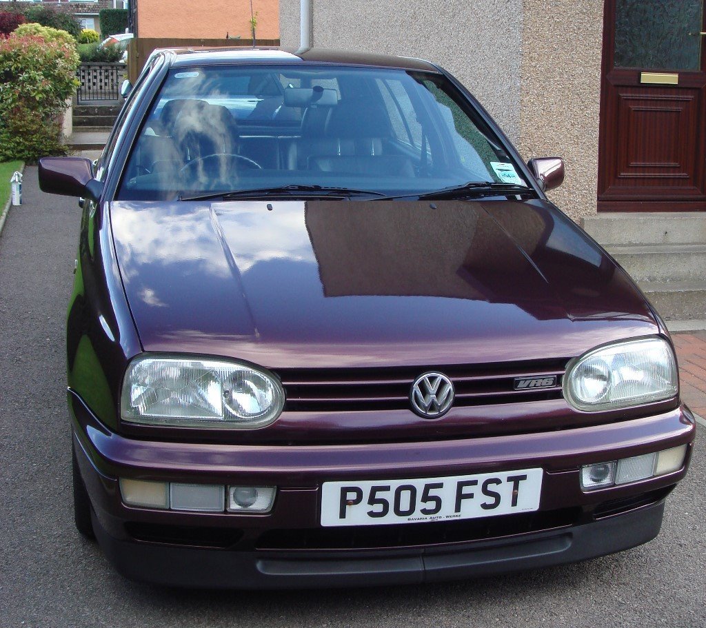 A purple Volkswagen Golf hatchback with a dog's head visible through the rear window is parked on a driveway. The car has a license plate that reads 'PS05 FST'. The house in the background has a brown door and a window with a white frame. | Vw Golf Vr6 Highline Edition In Mulberry Metallic In | d95cf15d7c47f30d5ce3e3dfa5793a29b42da3d49863a7e3ca5deea358149a9a | 000720947513 | 0 | 0 | 45 | 9 | 0 | 0 | |