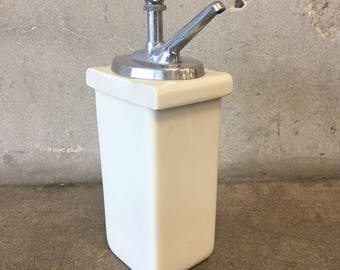 A white porcelain soap dispenser with a metallic faucet on top is placed on a concrete floor. The dispenser has a square base and a cylindrical body with a flat top. The faucet is attached to the top of the dispenser and has a metallic finish. | Vintage Soda Bar Coca Cola Syrup Dispenser (XRT66P) | b4a553474627185ce9750716efed8214622f50f2778fc31b6d7259442f103276 | 000720947546 | 0 | 0 | 46 | 8 | 0 | 0 | |