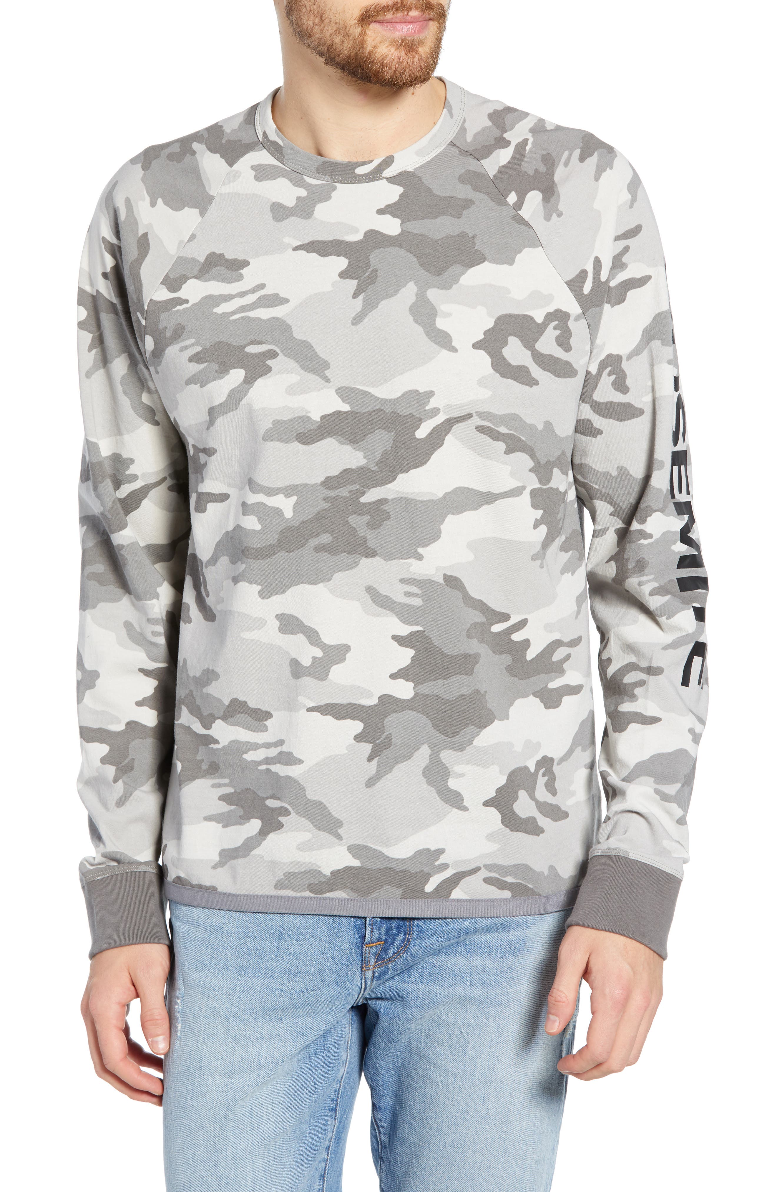 A man wearing a camouflage patterned long-sleeve sweater over a white t-shirt, paired with blue jeans. | JAMES PERSE,\n Long Sleeve Yosemite Camo Sweatshirt,\n Main thumbnail 1, color,\n 300 | ba087e2d36c4d25fec35d142bed8b3de8aa266f85a59a774c73f8119d34c243b | 000720947518 | 0 | 0 | 16 | 12 | 0 | 0 | |