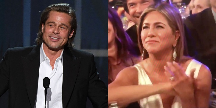 A side-by-side comparison of two images. On the left, a man with long hair and a beard is wearing a black suit and a white shirt, standing at a podium with a microphone in front of him. He is smiling and appears to be giving a speech. On the right, a woman with long hair and a white dress is clapping with her hands raised. She is also smiling and appears to be enjoying the event. | Brad Pitt and Jennifer Aniston at SAG Awards. | 182618871f6e8ad944db48d6015aaa33d10fc6de12979a371a783fc173f311d8 | 000720947650 | 0 | 0 | 76 | 8 | 0 | 0 | |