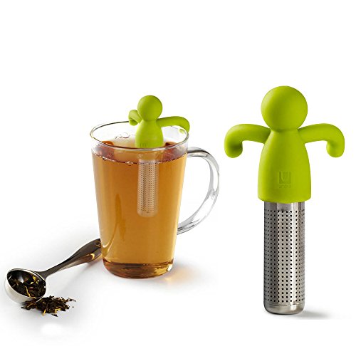 A glass teapot with a green silicone lid and handle is filled with tea, placed on a white background. Next to it, there is a green silicone tea infuser with a handle, and a silver spoon with tea leaves on it. | Umbra Buddy Loose Infuser Avocado product image | 75744b187f824891e89eb412b6e0097e173af4c923df88c0f20c2b585d204d0a | 000720947719 | 0 | 0 | 41 | 7 | 0 | 0 | |