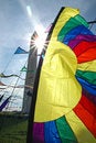 A colorful kite with a large yellow center and rainbow stripes is flying in the sky. The kite is positioned in front of a tall building, and the sun is shining brightly from behind the building, creating a lens flare effect. The kite is held by strings that are visible on the left side of the image. | Free Smithsonian Kite Festival 2007 Stock Image - 4935311 | f8d14a1d1b96eb0157647f002cefbe74e68cf593cac8f06f75c95ada05acd58b | 000720947735 | 0 | 0 | 57 | 9 | 0 | 0 | |