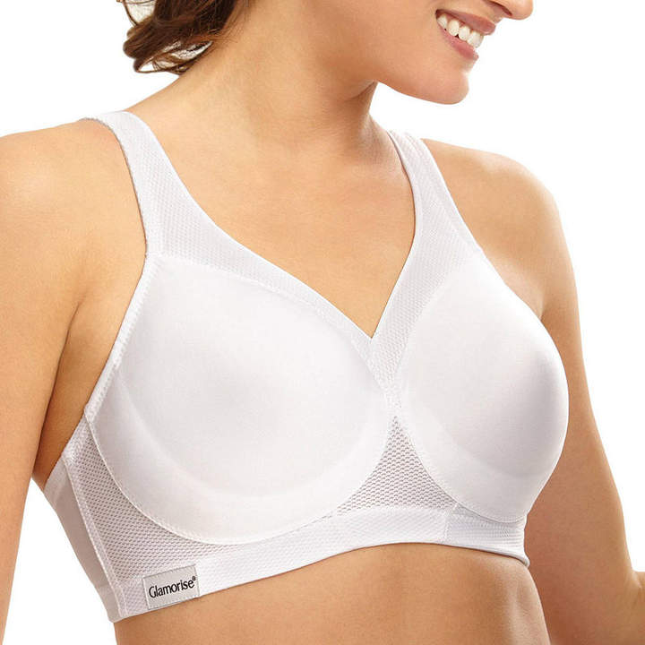 A woman is wearing a white sports bra with a small logo on the front. | Glamorise Magic Lift Ultimate Wireless Sports Bra-1006 | 348192b0e6278c71479c1151a59498b364836fc5b02860aa0ba56382c934e7ef | 000720947697 | 0 | 0 | 15 | 7 | 0 | 0 | |