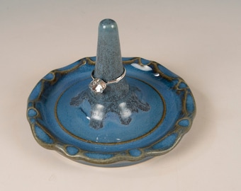 A blue ceramic ring holder with a textured surface and a ring on top is placed on a white surface. The holder has a circular base with a raised edge and a decorative pattern around the top. The ring is positioned at the center of the holder, and there is a small, round, white gemstone on the ring. | Ring Holder - Soft Blue glaze with decorative edge design - Wheel Thrown Stoneware by Seiz Art Pottery - FREE Shipping on all orders | 2fc20562e33c923b9f94e28f6280e5d4257e64d4301f82c103d50c747505d3c7 | 000720947994 | 0 | 0 | 58 | 24 | 0 | 0 | |