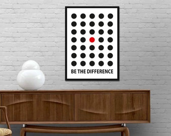 A framed picture of a black and white grid with a red dot in the center hangs on a white brick wall above a wooden sideboard with a white vase on top. | Be the difference Print. Motivational Quote Poster. Motivational Decor. Motivational Gift. Typography Prints. Inspirational Wall Art. Quotes | ca53dda25bd575d73b10704d15cf659c252d7d2bd8245c39ef36b434eb43d5c8 | 000720948167 | 0 | 0 | 32 | 17 | 0 | 0 | |