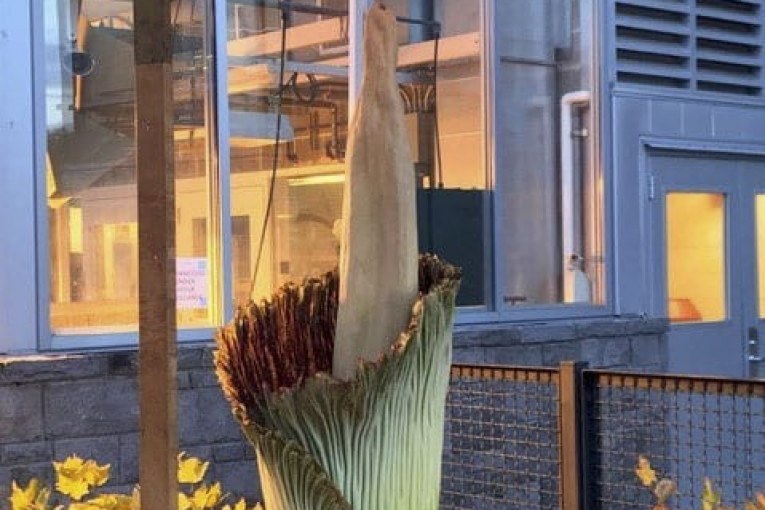 A tall, thin, and elongated plant with a pointed tip is growing in front of a building with large windows. The plant appears to be blooming, with a cluster of small yellow flowers at the top. The building has a modern design with a visible ventilation system on the roof. The scene is set during the day, and the lighting suggests it is either morning or late afternoon. | Rare Corpse Flower Now In Bloom At Wsu Vancouver Clarkcountytoday Com | 5e7226eaed4730920ed1219e1f42c62715d2f8ce830e1457c64d11702a900ef4 | 000720948164 | 0 | 0 | 68 | 11 | 0 | 0 | |