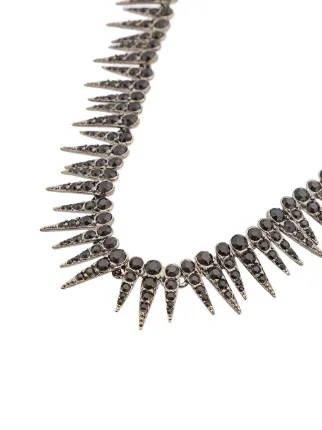 A close-up image of a black onyx necklace with a pointed, spiky design. The necklace features a series of onyx beads with a metallic clasp and a chain that extends upwards. The onyx beads are of varying sizes and are set in a metallic setting. The background is a plain, light color, which highlights the necklace. | Oscar De La Renta Crystal Sea Urchin Necklace | 7b277c2c655cdb1075f6db55874894cab7f2b7d369ad91cc4ba54044c759e1fd | 000720947146 | 0 | 0 | 56 | 8 | 0 | 0 | |