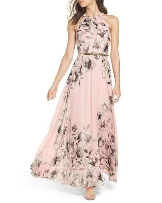 A woman is wearing a floral dress with a high neckline and a belt around the waist. The dress has a flared skirt and is knee-length. She is standing with her left hand on her hip and her right hand extended to the side. | Eliza J - Pink Belted Chiffon Maxi Dress - Lyst | d187987b0589369e64cf8495daf269a5c1ab13a8f140bd399cb80c9486a73511 | 000720948902 | 0 | 0 | 44 | 10 | 0 | 0 | |