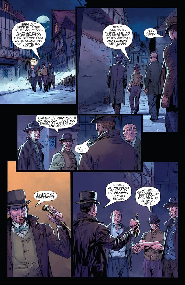A comic book page depicting a nighttime scene in a city alley with four panels. The first panel shows a group of men in hats and coats walking away from the viewer. The second panel features a man in a hat and coat holding a magnifying glass, examining something on the ground. The third panel shows a man in a hat and coat talking to another man, who is holding a small object. The fourth panel displays a man in a hat and coat holding a small object, with a speech bubble saying 'I'm not sure what this is, but it looks important.' The background includes buildings and a moonlit sky. | Sherlock Holmes: Moriarty Lives #3 (of 5): Digital Exclusive Edition | 98892d20570690f0d18ed3515fccf61b16c68a844a635f3762a18c6646e57151 | 000720948840 | 0 | 0 | 111 | 10 | 0 | 0 | |