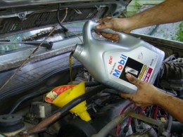A person is pouring oil from a Mobil oil can into a car's engine. The car's hood is open, and the oil can is positioned above the engine. The person's hands are visible, one holding the oil can and the other guiding the flow of oil. The car's interior is visible, including the steering wheel and dashboard. | Fill Engine with New Oil (autorepair.about) | 996ddc9b374443cb474104a9360b5080555c65e2906d6f4b14935f809bfb6b25 | 000720948815 | 0 | 0 | 57 | 6 | 0 | 0 | |