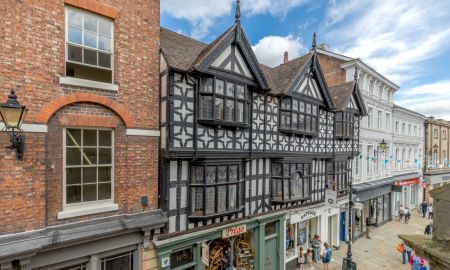 A black and white photograph of a Tudor-style building with a pointed roof and a clock on the side. The building is surrounded by other buildings with a cobblestone street in the foreground. There are people walking on the street, and a street lamp is visible on the left side of the image. | Shrewsbury, Shropshire | a9021c7a32b99cc8c36836508635cc804b541a0fd522b6390613bf108ee85594 | 000720949439 | 0 | 0 | 53 | 2 | 0 | 0 | |