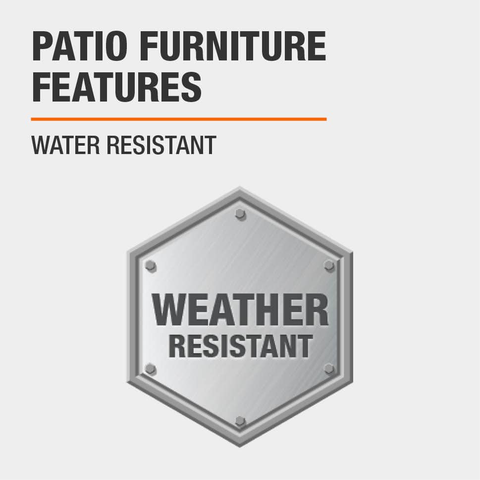 A close-up of a patio furniture feature label with the words 'WATER RESISTANT' and 'WEATHER RESISTANT' on a silver background. The label has a circular shape with a hexagonal pattern and a bolted design at the center. The text is in a bold font with the words 'WATER RESISTANT' on top and 'WEATHER RESISTANT' below. The background is a plain white color. | Patio Furniture Features Weather resistant | 2065edf03960838ae5d357f333e74fca9d52022b1709d29a9d3eae04b6a2d64b | 000720949530 | 0 | 0 | 62 | 5 | 0 | 0 | |