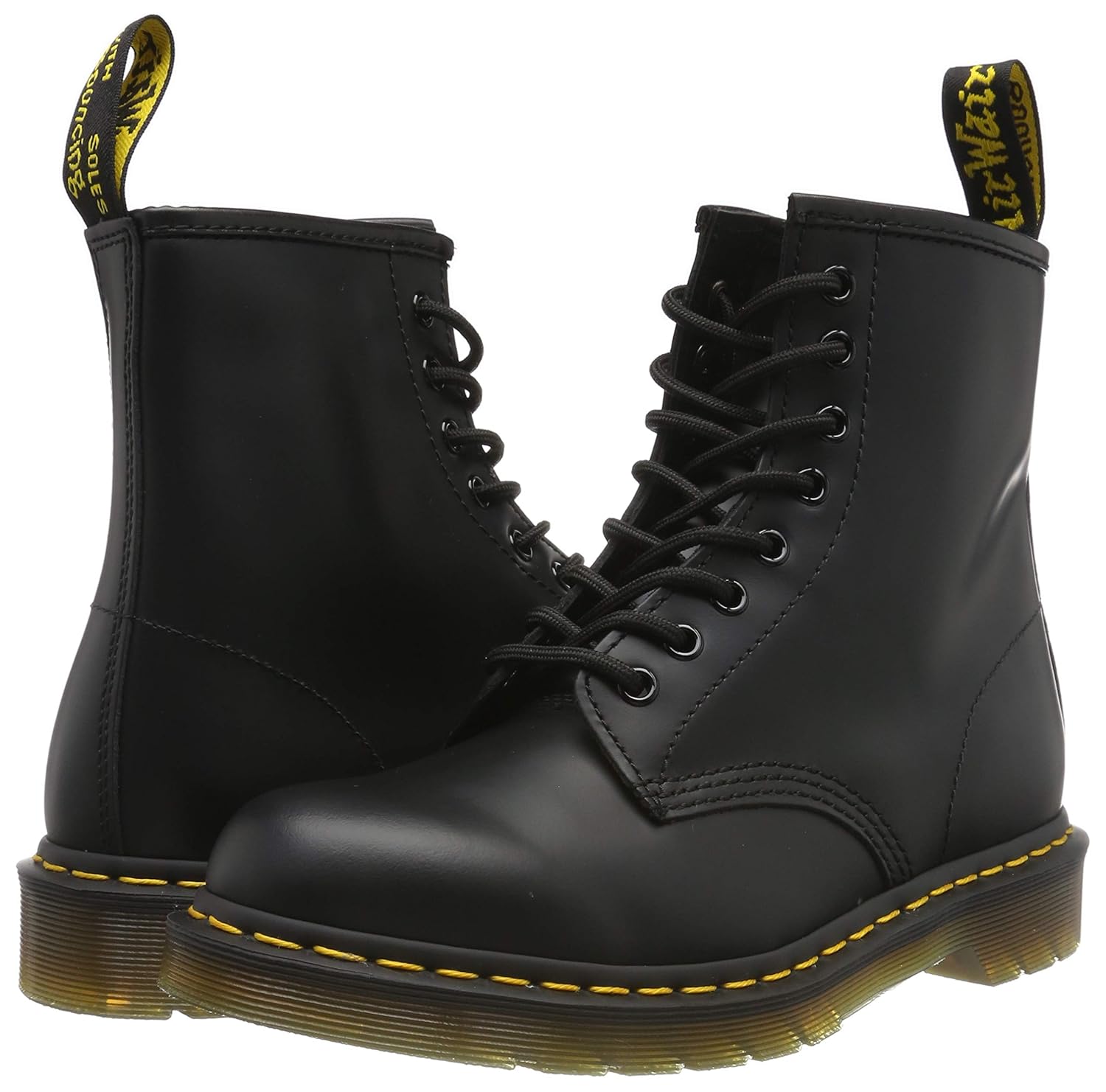 A pair of black leather boots with yellow stitching and a yellow label on the heel. The boots have a lace-up front with black laces, and the soles are black with a yellow glow effect. | Dr Martens Unisex 1460 Classic Black Leather Lace Up Boot 11822006 | 8de5149e2aa06bd4d87b3873a1e405b379dd1390d6afb7bdbbc44af57b54132b | 000720949405 | 0 | 0 | 35 | 11 | 0 | 0 | |