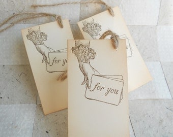 A collection of four vintage-style gift tags with a floral design and the word 'For You' written in cursive script. Each tag has a brown string tied to the top, and they are arranged on a textured surface with a checkered pattern. | Wedding gift favors, thank you tags hand stamped with a jester's hand holding 'for you' or 'Thank you' cards, tied w/twine, set of 24 | 05f35be8b60a8ed7d66f65bfdefa64ab81dca1a9d785047847302179cec9b53e | 000720949556 | 0 | 0 | 42 | 24 | 0 | 0 | |