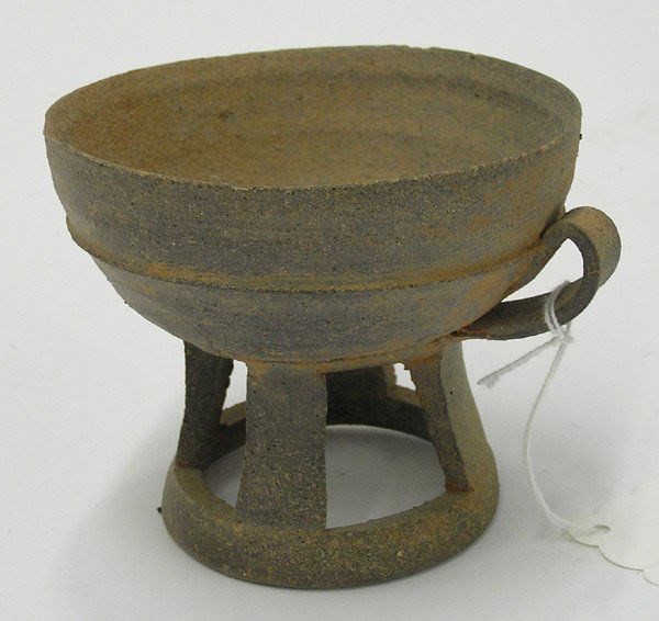 A rustic clay pot with a textured surface and a dark brown color sits on a white background. The pot has a curved handle on one side and a small, square base that elevates it slightly off the surface. A white tag with a string is attached to the handle, hanging down towards the bottom of the pot. | 102: Korean Ceramic Cup, Silla | 53575a33720e24de66f692ece047b9fdf8b3b66e4d64c98c9122e056755b61e3 | 000720949435 | 0 | 0 | 58 | 5 | 0 | 0 | |