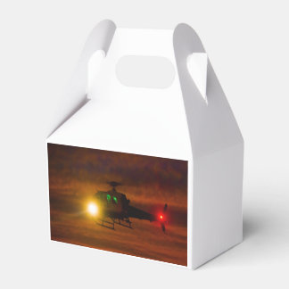 A white takeout container with a clear plastic window on the front, showcasing a nighttime scene with a helicopter flying over a desert landscape. The helicopter has its landing lights on, illuminating the scene below. The container has a handle on top and is placed against a white background. | Sunset Rescue Favor Box | 8f35f7cf93d7bb36acca0fc0a4f8d038523578269c268f6d7e9ae5e0d7d77b07 | 000720949612 | 0 | 0 | 49 | 4 | 0 | 0 | |