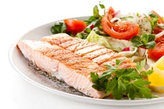 A plate of food with a piece of salmon on the left side, garnished with parsley and lemon slices. The salmon is cooked and has a pinkish color. On the right side of the plate, there is a salad consisting of lettuce, cherry tomatoes, and cucumber slices. The plate is on a white surface, and the overall lighting is soft and natural. | Grilled salmon Royalty Free Stock Image | 1802d4c99baffc78b1c642d543d31b552ac505c687ad6259f490fa30b62d6dd2 | 000720949571 | 0 | 0 | 62 | 6 | 0 | 0 | |