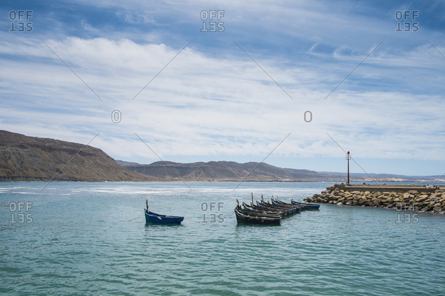 A serene coastal scene with a clear blue sky and a few clouds. The ocean is calm with gentle waves lapping against the shore. A small boat is moored near the water's edge, and a wooden dock extends into the water. The dock is lined with rocks, and there are several other boats tied to it. The landscape includes a hillside with sparse vegetation. | Boats docked on rocky pier in remote harbor | 5085b1b623198b60182b7191b994a73d6295a2788d9d825f58c2768dbc4b2f1f | 000720949636 | 0 | 0 | 64 | 8 | 0 | 0 | |