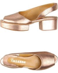 A pair of gold-colored flat shoes with a smooth finish and a simple design. The shoes have a low heel and a flat sole, with a strap that wraps around the ankle and a buckle closure. The brand name 'Arianna' is written in white letters on the side of the shoe. | About Arianne Sandals - Lyst | 6e7d609c4cbeb5679c2cb84fcb2a6b0a3150e94e87a5c853696c7f53eb0538c3 | 000720949622 | 0 | 0 | 51 | 5 | 0 | 0 | |